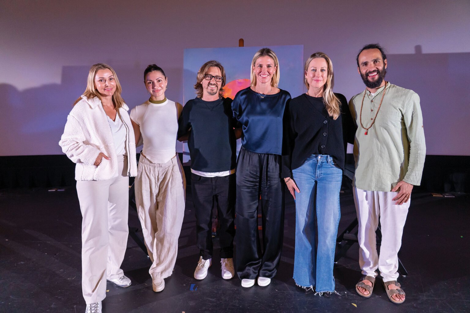 Upon arrival, guests were greeted in the lobby with a carefully curated display of Michaelian’s frequency artworks. These pieces set the tone for a transformative experience, inviting participants to connect with their inner selves. The artwork served as a visual representation of healing frequencies, an integral theme of the event. Once inside the theater, attendees were treated to a captivating large-scale art installation created in collaboration with digital artist Josh Pierce. This mesmerizing display intertwined nature-inspired visuals with Michaelian’s unique artistic approach, effectively blending beauty and wellness.