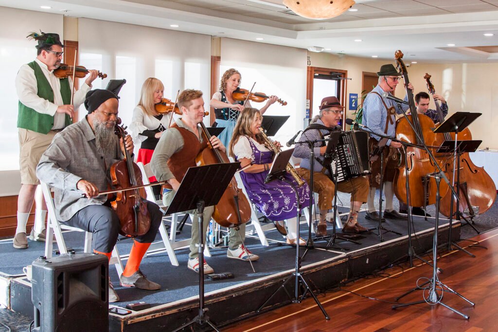 On October 19, the Hutchins Consort celebrated Oktoberfest at the Bahia Corinthian Yacht Club in Corona del Mar. This festive event drew more than 100 passionate supporters dressed in celebratory attire, turning the yacht club into a vibrant affair filled with polkas and classic favorites like the Chicken Dance (Der Ententanz). As the sun set over the picturesque bay, the combination of lively music and a joyful atmosphere brought attendees to the dance floor, making the evening an unforgettable experience for everyone involved.